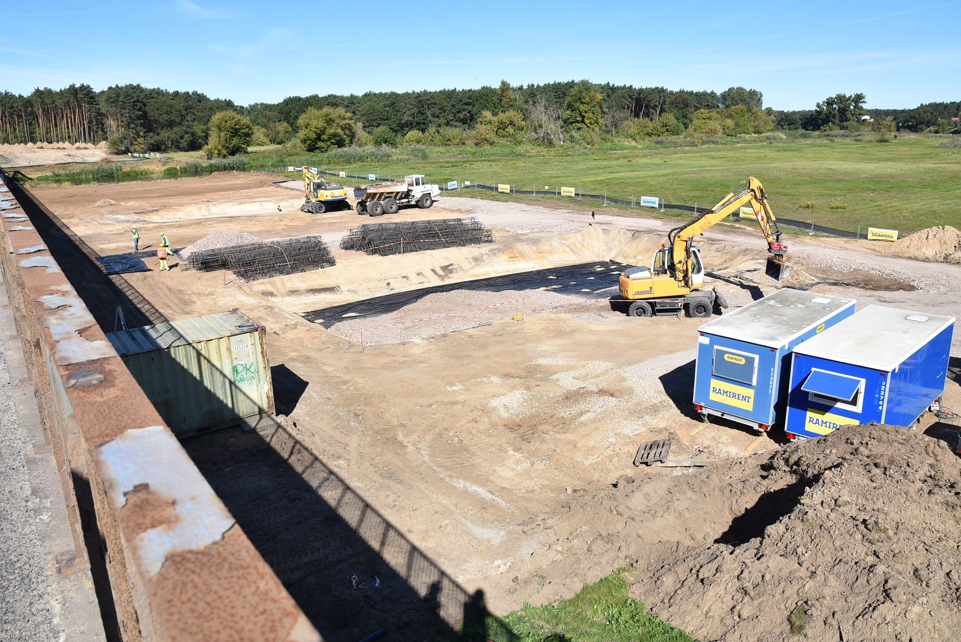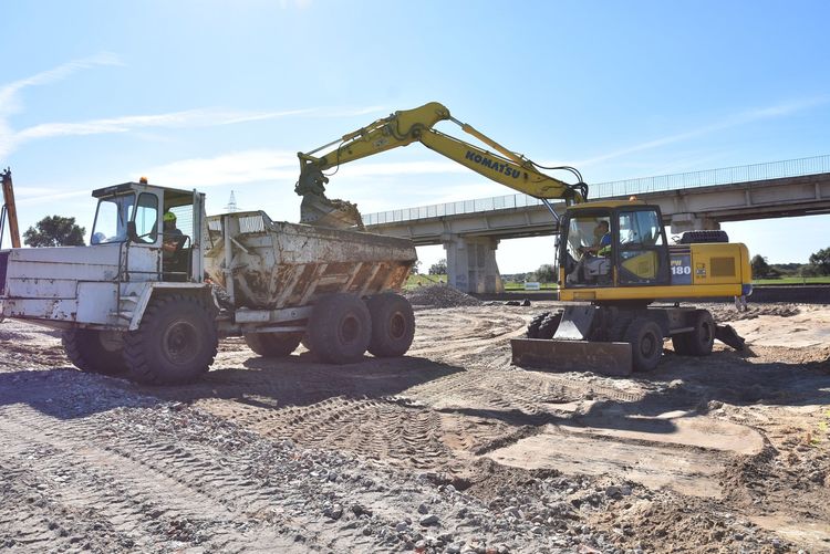 Teren przy moście stał się wielkim placem budowy, pracę rozpoczął ciężki sprzęt. Trwają przygotowania do rozpoczęcia wykonania pali pod podpory obiektu.